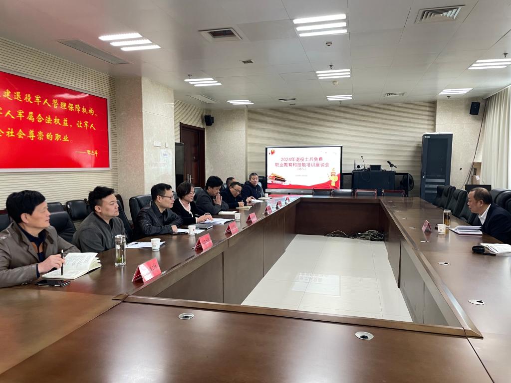 2024320日上午,九江市退役军人事务局召开2024年退役士兵免费职业教育和技能培训座谈会,全市7所承训机构工作人员参会。九江市退役军人事务局副局长陶建敏主持会议,我院党委副书记卢小澍、培训办主任仲伟佳参会。