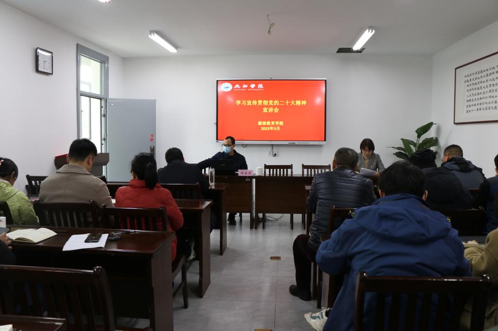 3月1日下午,继续教育学院举行学习宣传贯彻党的二十大精神宣讲会。学校马克思主义学院教师周春芸博士以《凝心聚力新征程 笃行奋进复兴路——学习贯彻党的二十大精神》为题作了宣讲报告。宣讲会由学院党委书记王英姿主持,全体教职工参加。