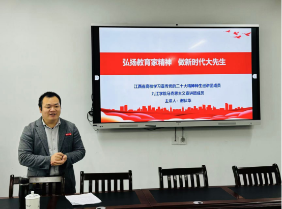 为深入学习贯彻习近平总书记关于教育的重要论述,大力弘扬教育家精神,进一步提升学院师德师风建设水平。11月20日,马克思主义学院副院长谢伏华博士为我院教职工开展了一场以“弘扬教育家精神, 做新时代大先生”为主题的师德师风宣讲活动,此次活动由院党委书记王英姿主持。